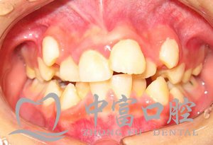 犬齿外突(虎牙)牙弓与牙齿大小无法配合,空间不够导致牙齿重叠拥挤状态,下颌则以第二小臼齿最晚萌发而拥向舌侧。
