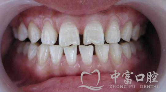 齿间缝隙牙弓与牙齿大小无法配合,当牙齿太小牙弓太大时,会造成牙齿排列稀、有缝隙。