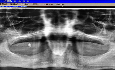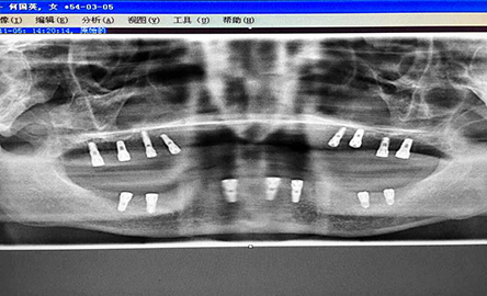 来院后,周海燕医生为其检查,从口腔全景片、全口CT检查发现,何女士由于多年的牙周炎,长期缺牙佩戴活动假牙,导致牙槽骨严重萎缩,骨量不足,壁薄,增加了治疗难度,普通的口腔医生无法进行这种高难度的全口无牙种植。